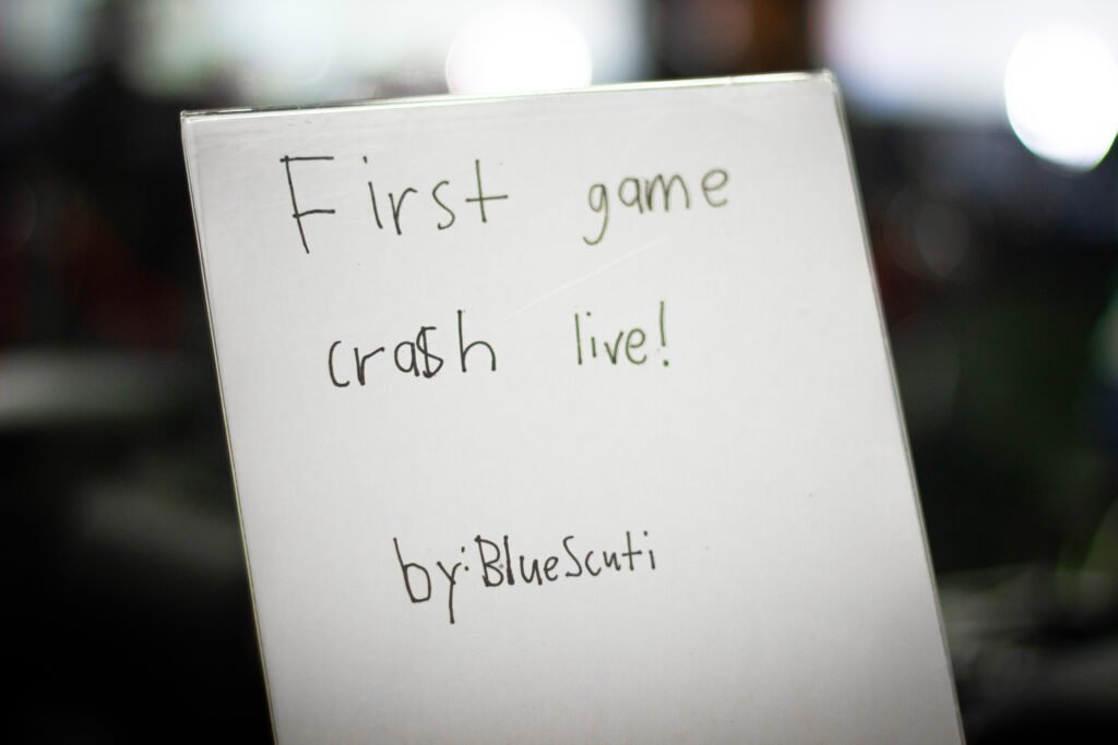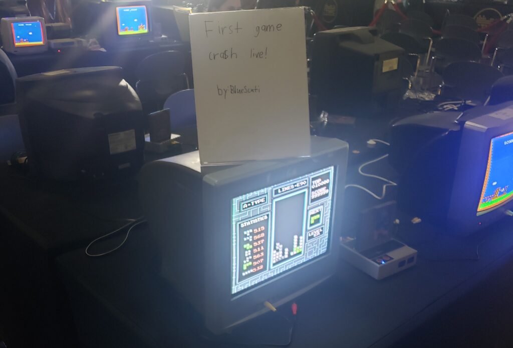 Blue Scuti was at one of the game stations, casually using the Rolling technique to attempt a Level World Record. As he approached the crash points, his board was messy, so he opted to crash the game by clearing a single at the level transition. The crowd applauded as they had just witnessed the first live game crash.